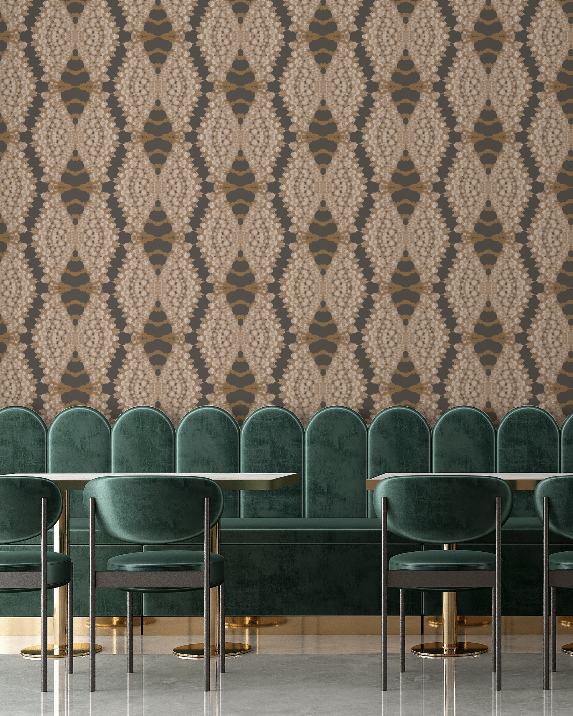 Lacey fans in bold colors of golden incense and parchment. Presented on a soot gray ground that is customizable to your project. Original art hand-folded and dyed by Shea in final photo.