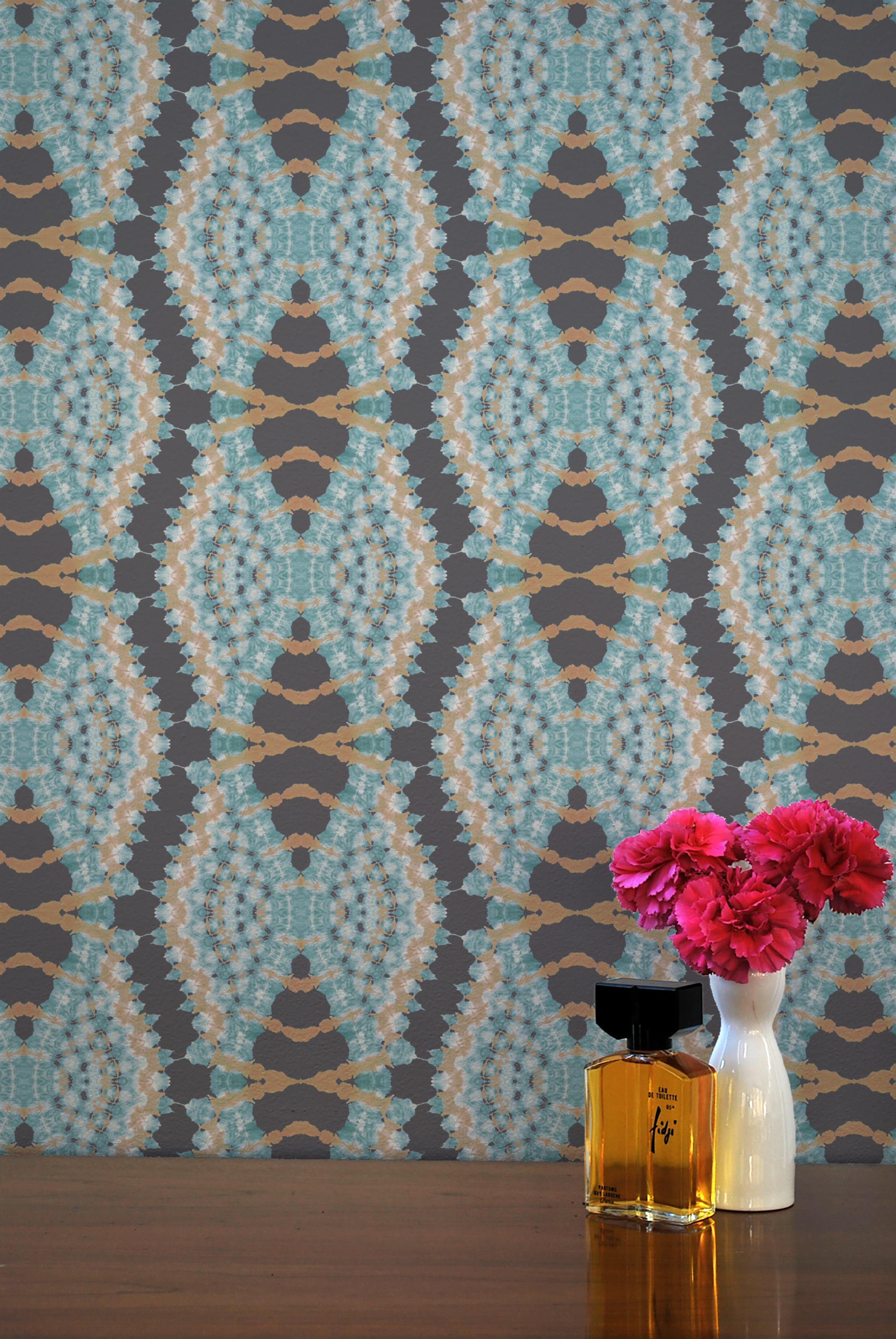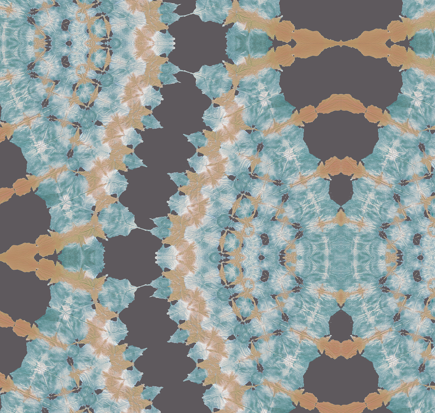 Lacey fans in rich colors of frosty sage and honey gold inspired by the Asian safflower. Presented on a steel gray ground that is customizable to your project. Original art hand-folded and dyed by Shea in final photo.