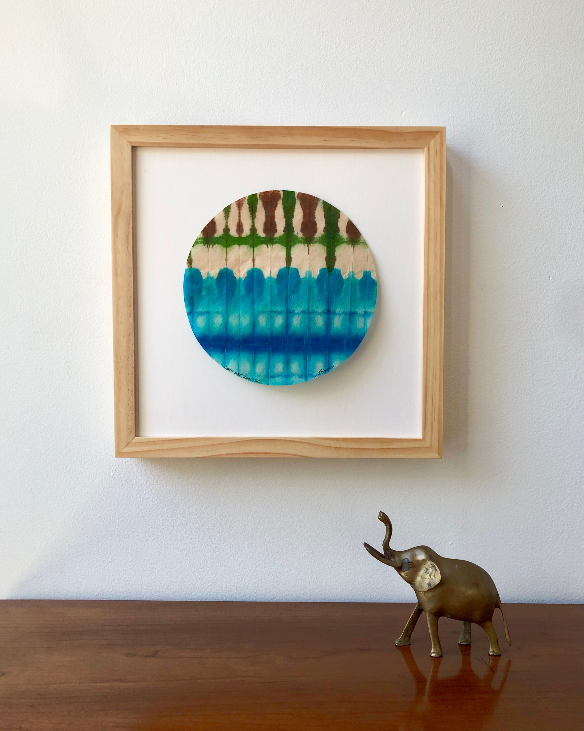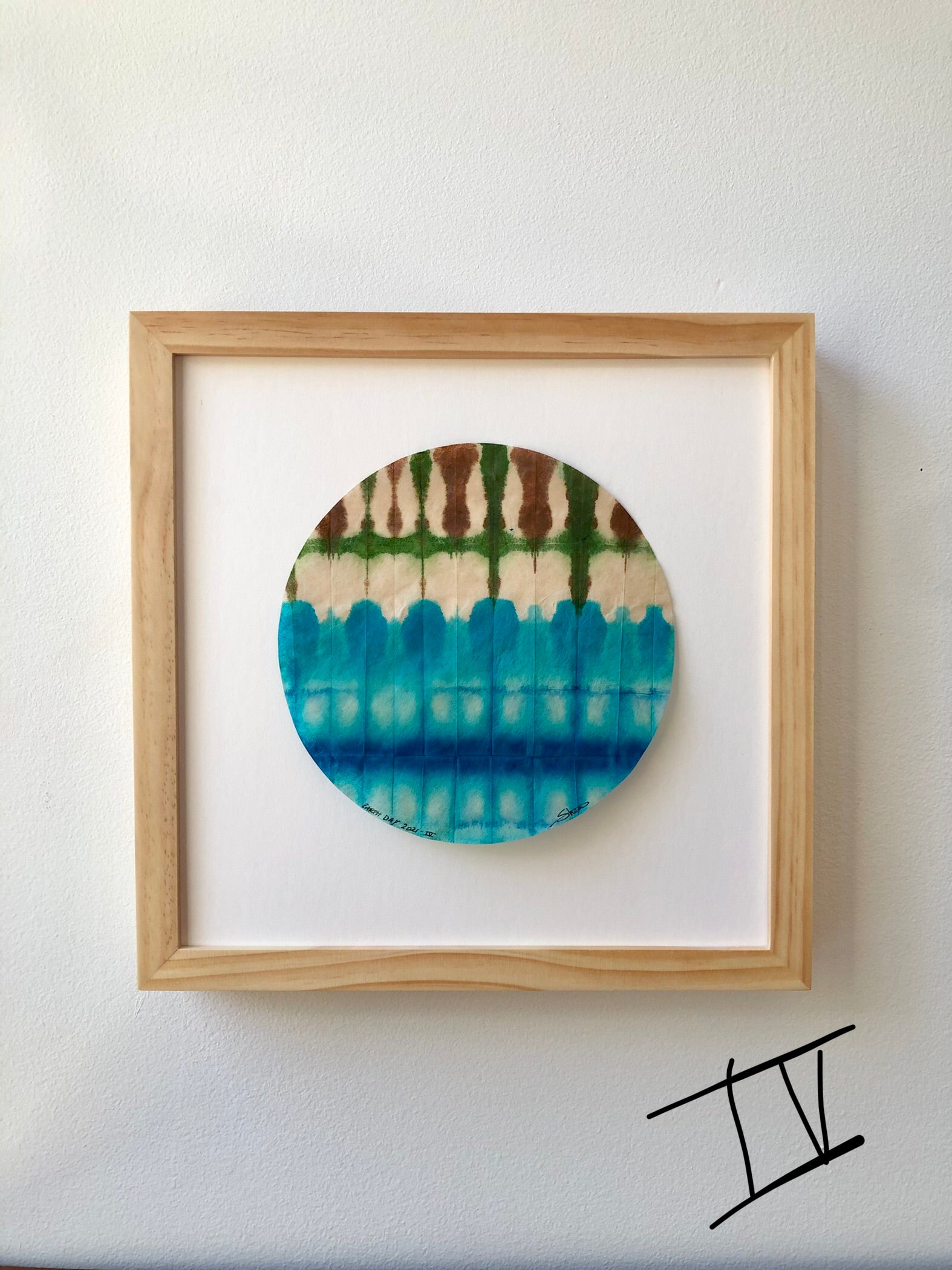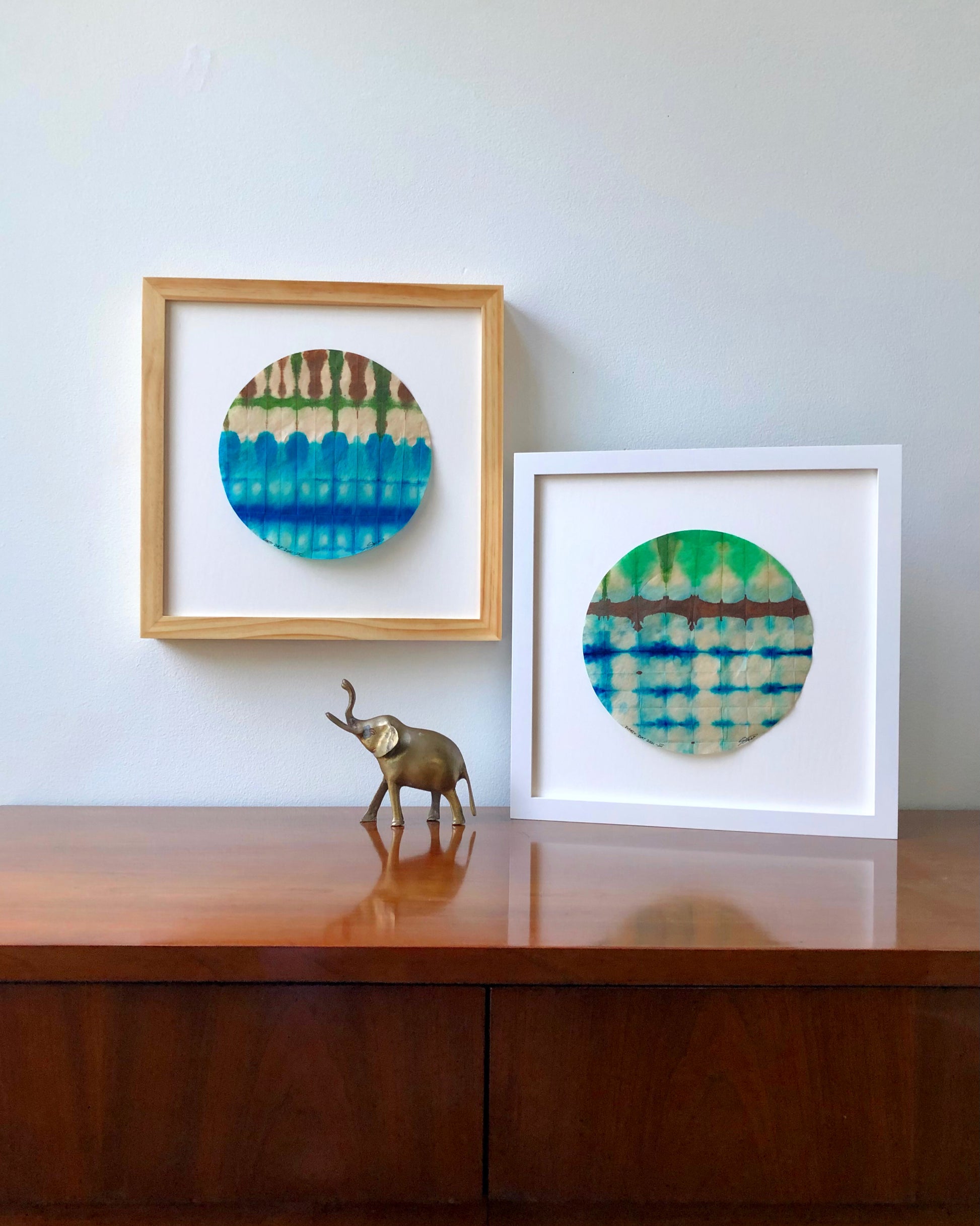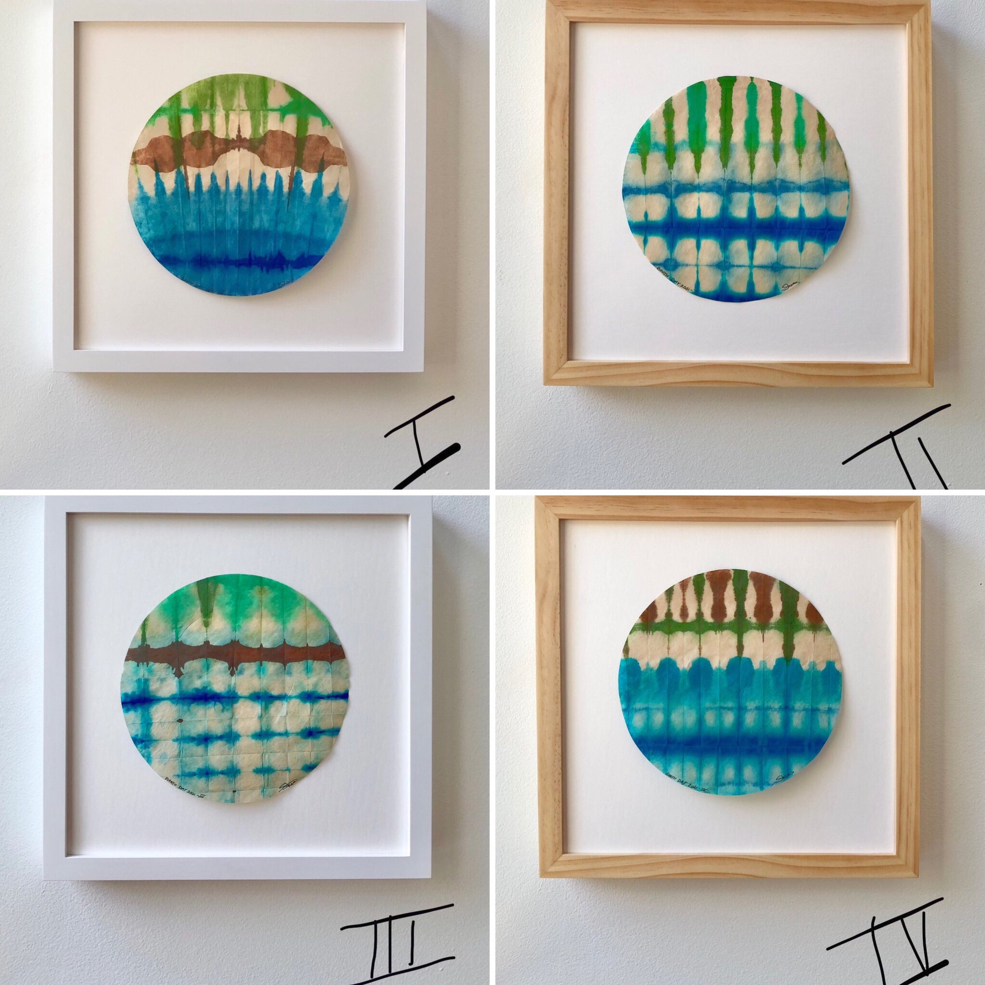 Each piece was dyed on round specialty paper in one session. They are delicate and should be hung in a dry place away from direct sunlight.