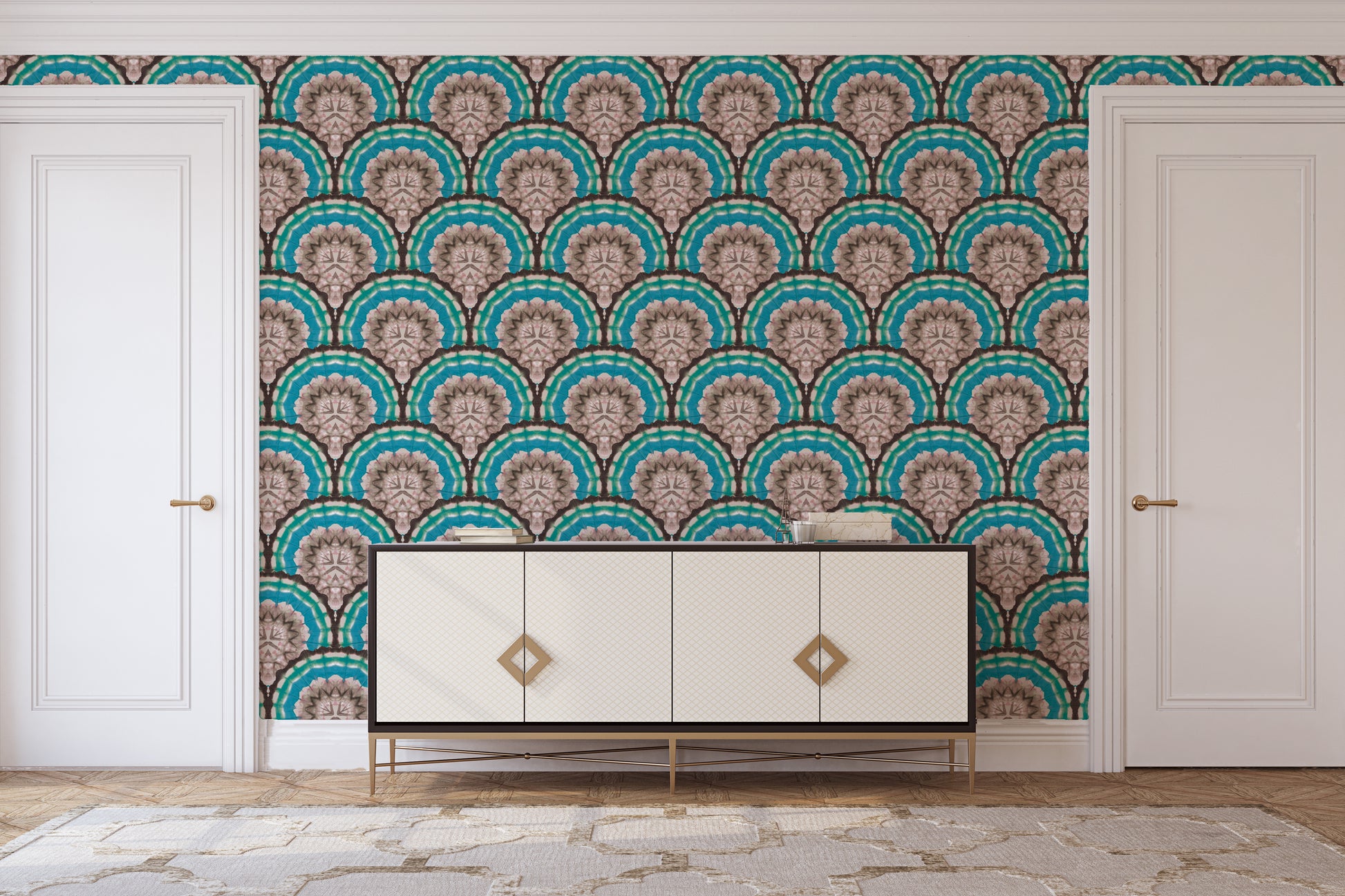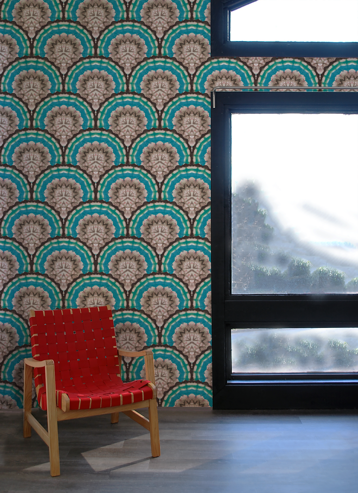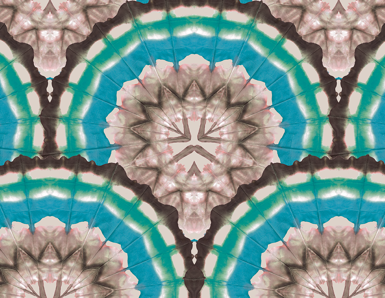 Hand-folded scallops in shades of teal, turquoise, and black can be directed upwards or downwards upon installation. Original art by Shea in final photo.