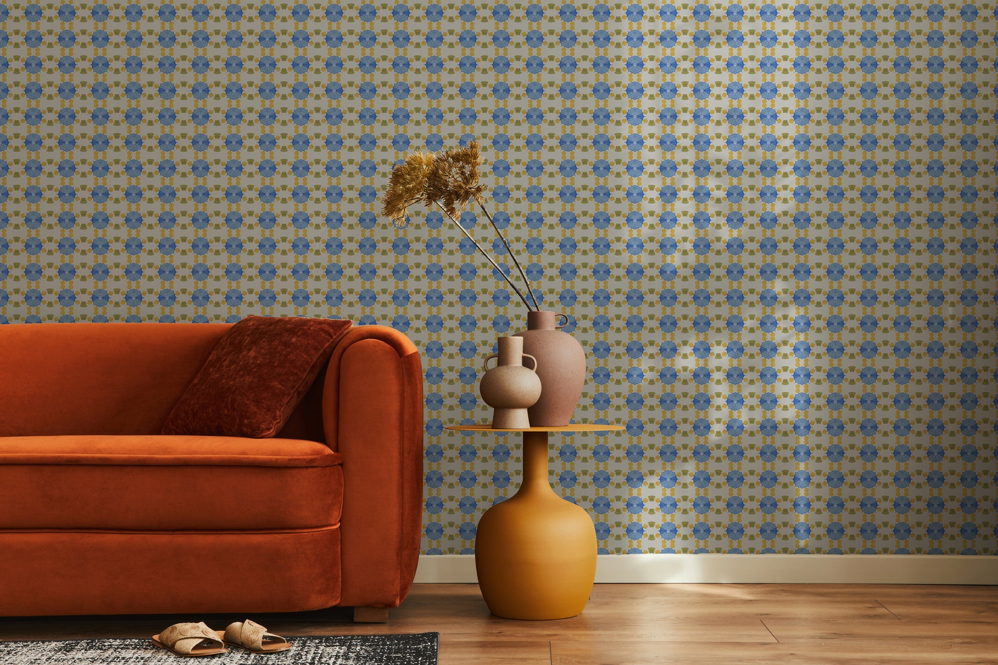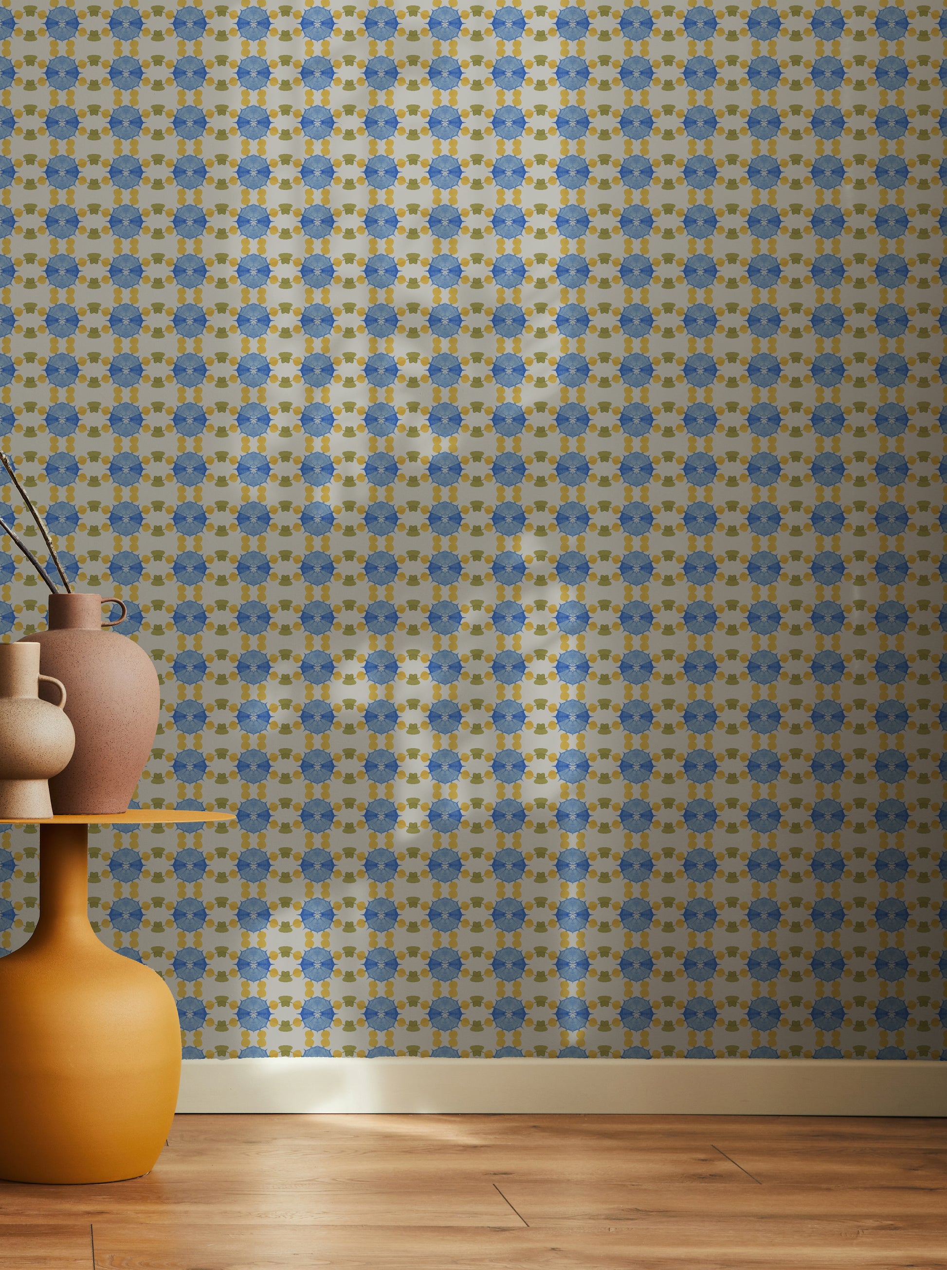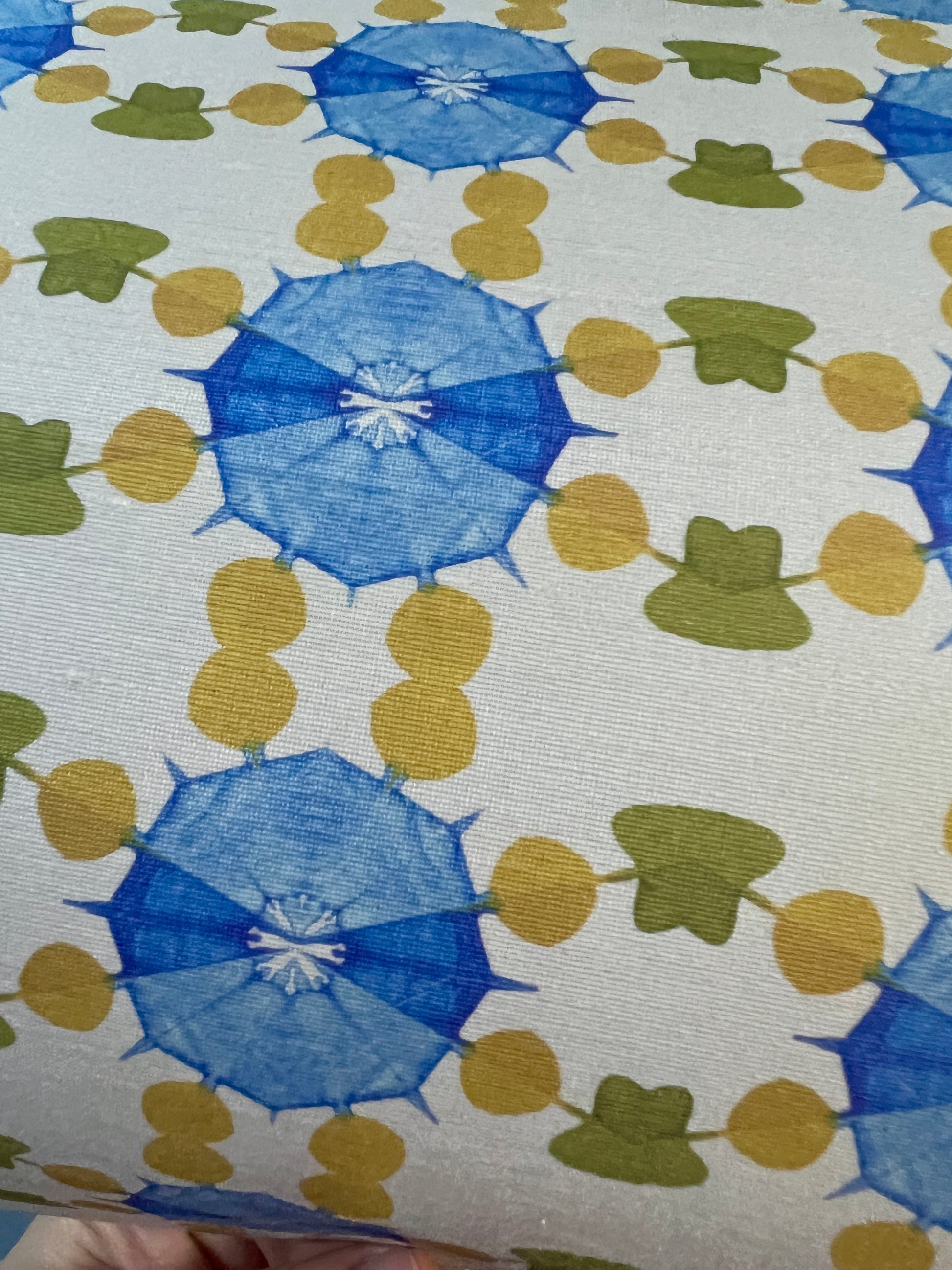 Ultramarine bursts play with olive and lemon in a punchy, garland grid. Crafted from a single piece of hand-folded and dyed art by Shea.