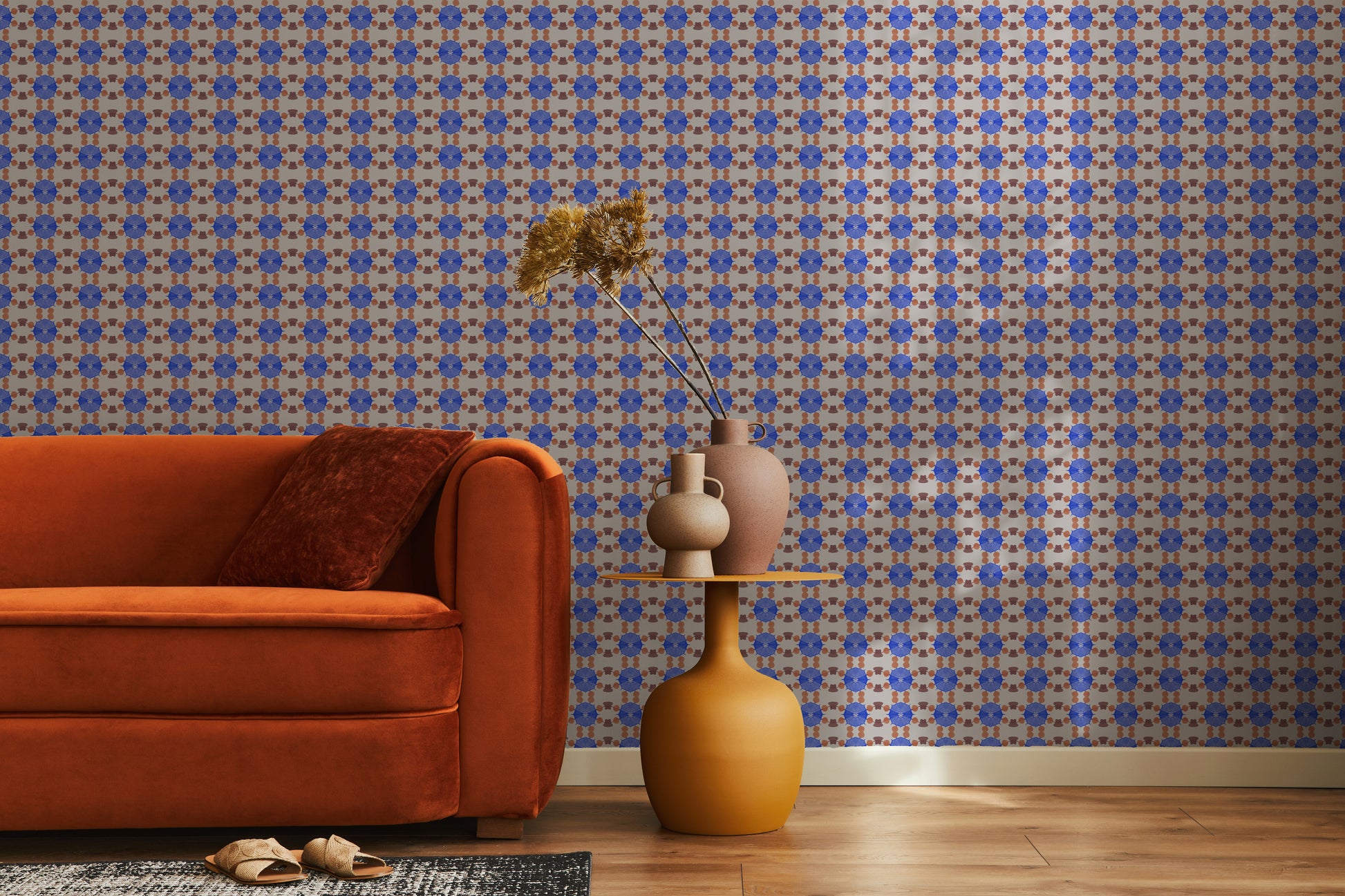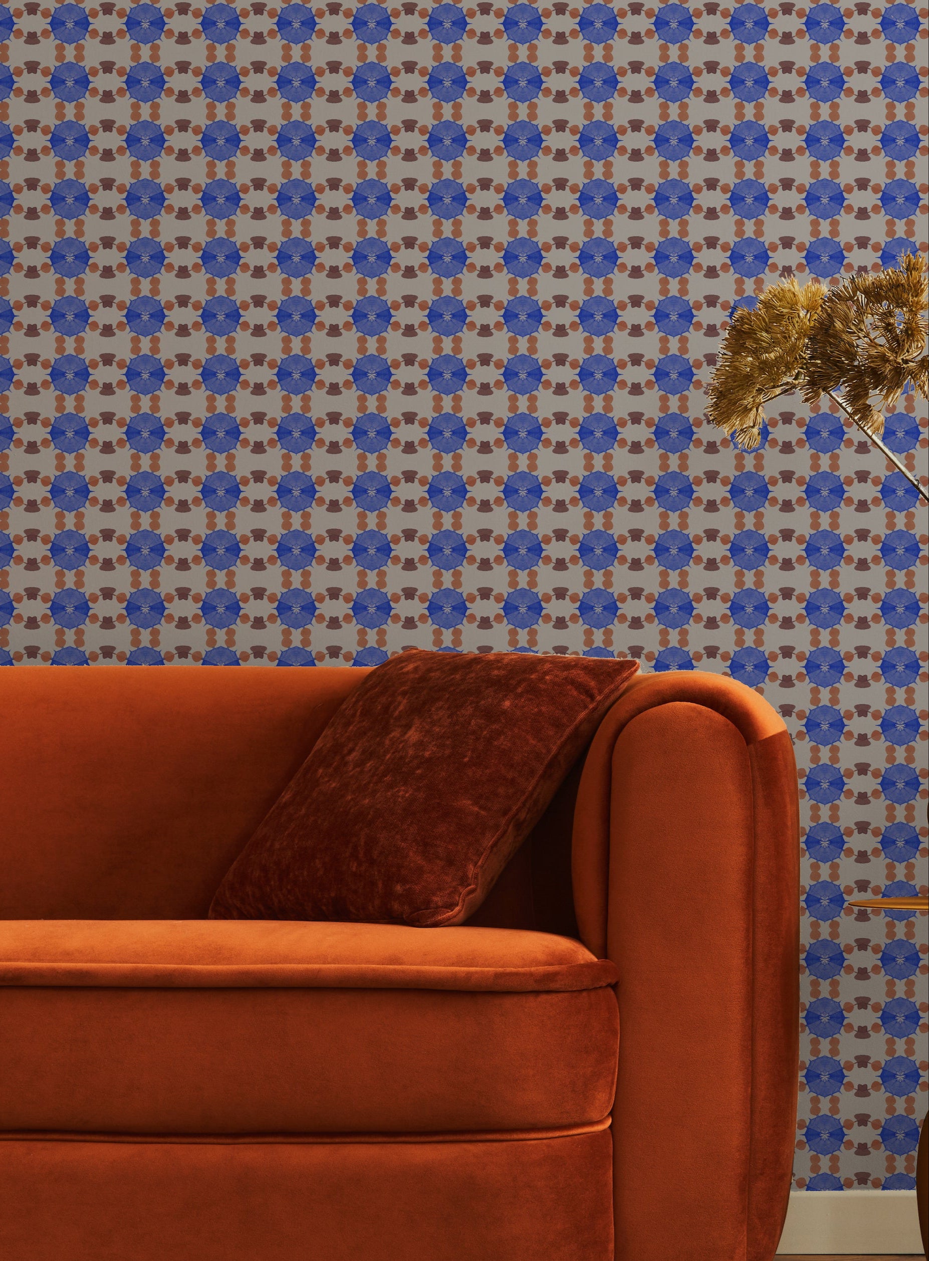 Deep sea blue bursts play with faded red and enameled wood in a punchy, garland grid. Crafted from a single piece of hand-folded and dyed art by Shea.