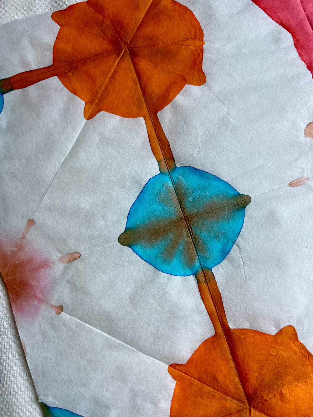 Cobalt, plátano, and turquoise play together in this tropical trellis. Presented on a slate ground customizable to your project. Original art hand-folded and dyed by Shea in final photo.