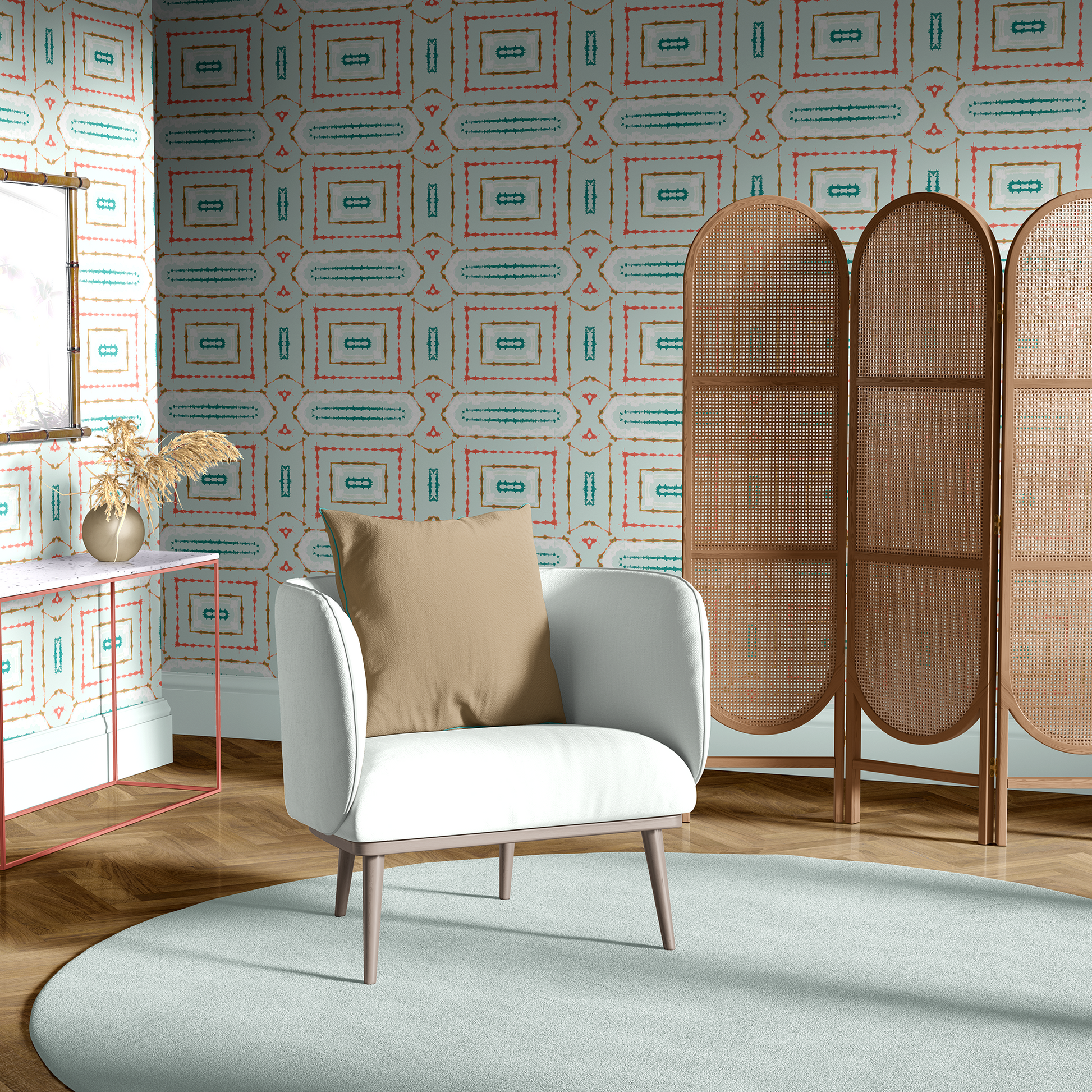 Found objects and treasure in teal, coral, and smelted bronze dance in formation to summon water from the gods. Presented on a mint ground customizable to your project. Original art hand-folded and dyed by Shea shown in final photo.