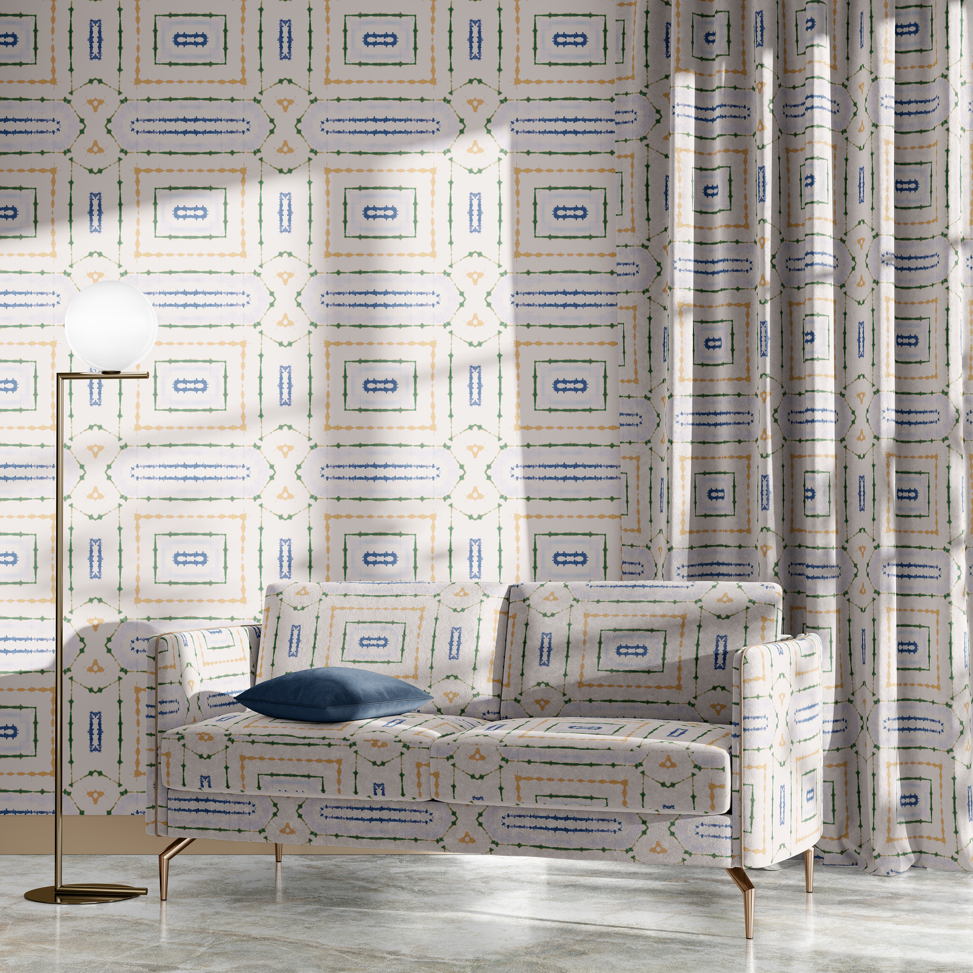 Found objects and treasure in verdigris, buff, and coquina blue dance in formation to summon water from the gods. Presented on a pale pink sand ground customizable to your project. Original art hand-folded and dyed by Shea shown in final photo.
